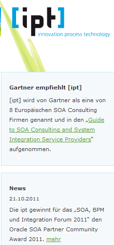 News Die ipt gewinnt für das „SOA, BPM und Integration Forum 2011“ den Oracle SOA Partner Community Award 2011. mehr