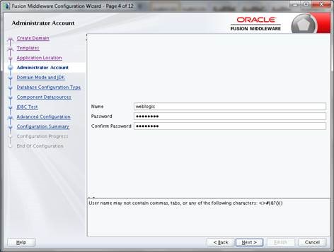 Define the Administrator Account User and password (in my case it will be weblogic for User and welcome1 for Password) and Click in Next button: