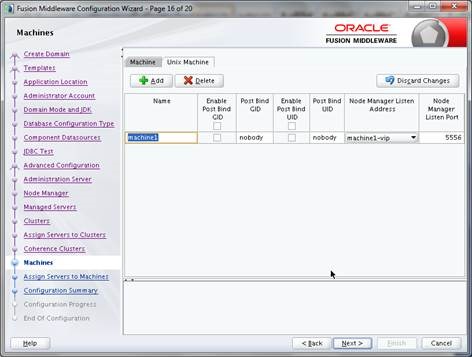 Enter the Machine information (in my case it will be machine1 for Name, machine1-vip for Node Manager Listen Address and 5556 for Node Manager Listen Port) then click in Next button: