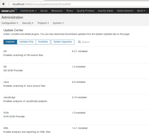 I’ve used the XML Plugin in SonarQube to define XPath rules. This first needs to be installed. Administration, System, Update Center and install the plugin: