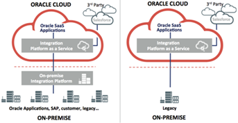 - On-premise to cloud: Integration is done in the cloud (e.g., using ICS) or on an on-premise integration platform