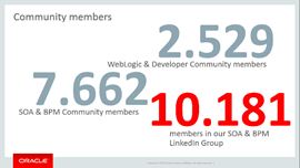 At our last conference I was excited to announce that the WebLogic & Developer Community achieved 2.529 members and the SOA & BPM Community 7.662 members. Combined we reached more than 10.181 partner community members. There are by far the largest and most active partner communities within the Oracle Partner Network. Every month we distribute our community newsletters, host our webcasts and interact in social media. What’s next? #jkwc