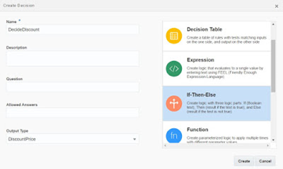 In my previous blog, I showed how to get started with Decision Model Notation (DMN) in Oracle Process Cloud Service and how to create a simple Decision Table. Picking up from there, we will now look into creating If-Then-Else rules, which should also be familiar to people who know Oracle’s old Business Rules. We will also create a service and call it from a process.