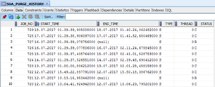 Luckily, there’s a very simple way to find out and keep track, just by looking into the SOA_PURGE_HISTORY table inside the SOAINFRA schema: