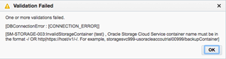 Also the error message(s) is not that helpful. “Validation Failed” could mean anything. “Check the log file for the real cause” makes me wonder in case of a PaaS service. What worked for SOA CS is using pre-creating the container and using the REST endpoint of the storage service.
