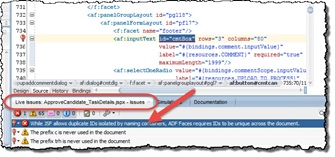 1. In JDeveloper, click the Source tab at the lower left corner of the form that has the error. Read the complete article here.