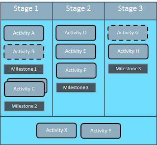 Except for the case itself, all other components can explicitly be activated/enabled or terminated/completed based on conditions. For example in the dynamic process above Milestone 1 is activated once Activity A is completed, and Stage 2 is to be activated once Stage 1 is completed.