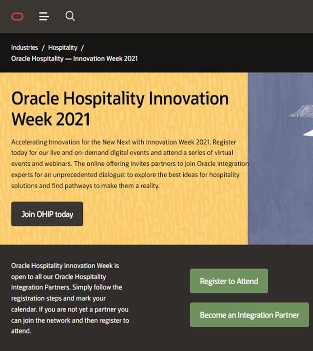 Accelerating Innovation for the New Next with Innovation Week 2021. Register today for our live and on-demand digital events and attend a series of virtual events and webinars. The online offering invites partners to join Oracle integration experts for an unprecedented dialogue: to explore the best ideas for hospitality solutions and find pathways to make them a reality.