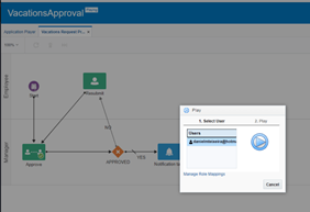 The easy way to test the development efforts is straight from the canvas. By pressing the play button the workflow will start and we are given the choice about the user that is playing a role in the execution. Think of this as a sort of Unit Test! You can select who initiates the process and who approves it and act as those users. In this process the start is via a Form read the complete article here.