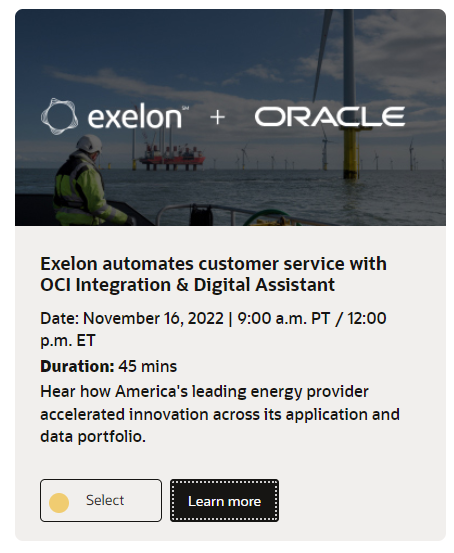 oin Exelon’s lead architect, Kumar Thakur, and Suhas Uliyar, Oracle’s Vice President Product Management in our next live session in the Integration Customer Success Webcast Series, to gain the best practices and insights that have helped America’s leading energy provider accelerate innovation across its application and data portfolio.