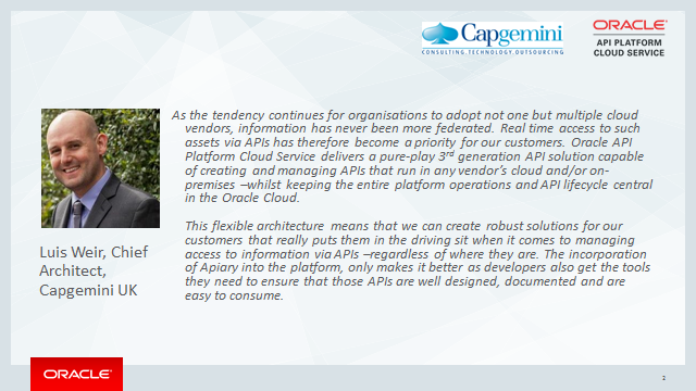 “As the tendency continues for organizations to adopt not one but multiple cloud vendors, information has never been more federated. Real time access to such assets via APIs has therefore become a priority for our customers. Oracle API Platform Cloud Service delivers a pure-play 3rd generation API solution capable of creating and managing APIs that run in any vendor’s cloud and/or on-premises –whilst keeping the entire platform operations and API lifecycle central in the Oracle Cloud.
